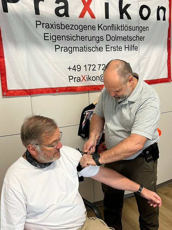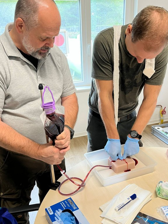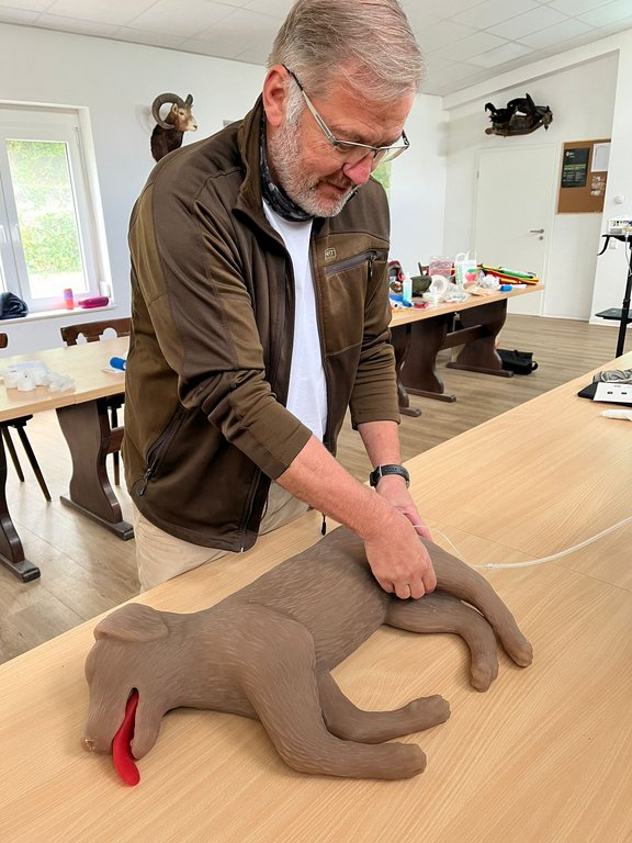 Das Seminar war in zwei Gruppen aufgeteilt, die nach etwa 4 Stunden die Themenbereiche tauschten. Der Fokus lag auf praktischem Üben direkt an den Kursteilnehmern – trockene Theorie kam hier nicht zum Einsatz! Anhand realistischer Szenarien aus dem Jägerleben, wie Schnittwunden beim Aufbrechen oder Verletzungen des Hundes durch eine Sau, übten die Teilnehmer, wie sie sich selbst, ihre Jagdkameraden oder ihren Hund schnell und effektiv versorgen können. Diese praxisnahen Beispiele sorgten für hohe Motivation, die Handgriffe sicher zu beherrschen.