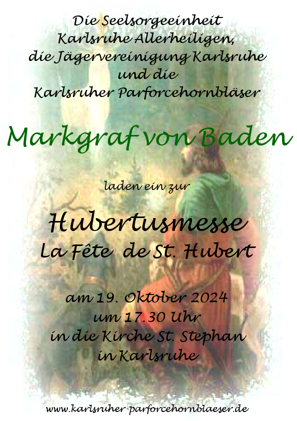Die Jägervereinigung Karlsruhe, die Karlsruher Parforcehornbläser MARKGRAF VON BADEN, das Jagdhornbläsercorps Karlsruhe und die Jagdhornbläser Hubertus Malsch laden für den 19. Oktober um 17.30 Uhr die Jägerschaft sowie alle Angehörigen und Freunde der Jagd zur feierlichen Hubertusmesse zu Ehren des Schutzpatrons der Jäger in die katholische Stadtkirche St. Stephan in Karlsruhe ein.