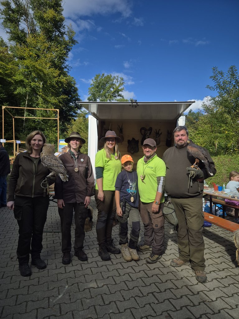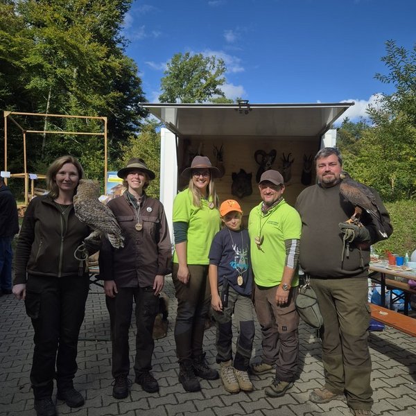 Ein besonderes Highlight bot die Jägervereinigung Karlsruhe: Lernort-Natur-Obfrau Isabel Berger holte sich Unterstützung von zwei LJV-Naturpädagogen der KJV Bruchsal, die mit dem Lernort-Natur-Mobil vollgepackt mit Präparaten angereist waren. Zusätzlich sorgten zwei Falkner der KJV Bruchsal für eindrucksvolle Einblicke in die Welt der Greifvögel. Gemeinsam gelang es, den Besucherinnen und Besuchern die heimische Tierwelt auf anschauliche und spannende Weise näherzubringen.
